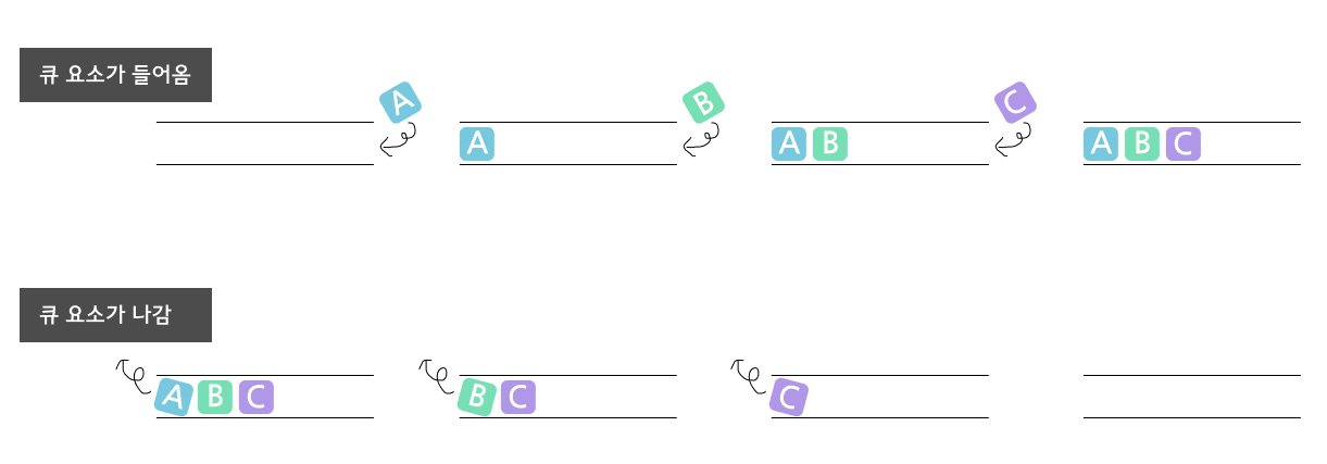 자료구조 '큐'는 FIFO라는 형태로서 First In First Out, 선입선출이라고도 부르는 형태이다. 첫번째로 들어온것이 첫번째로 나가게 된다라는 것으로 간단히 그림으로 표현하면 다음과 같다
