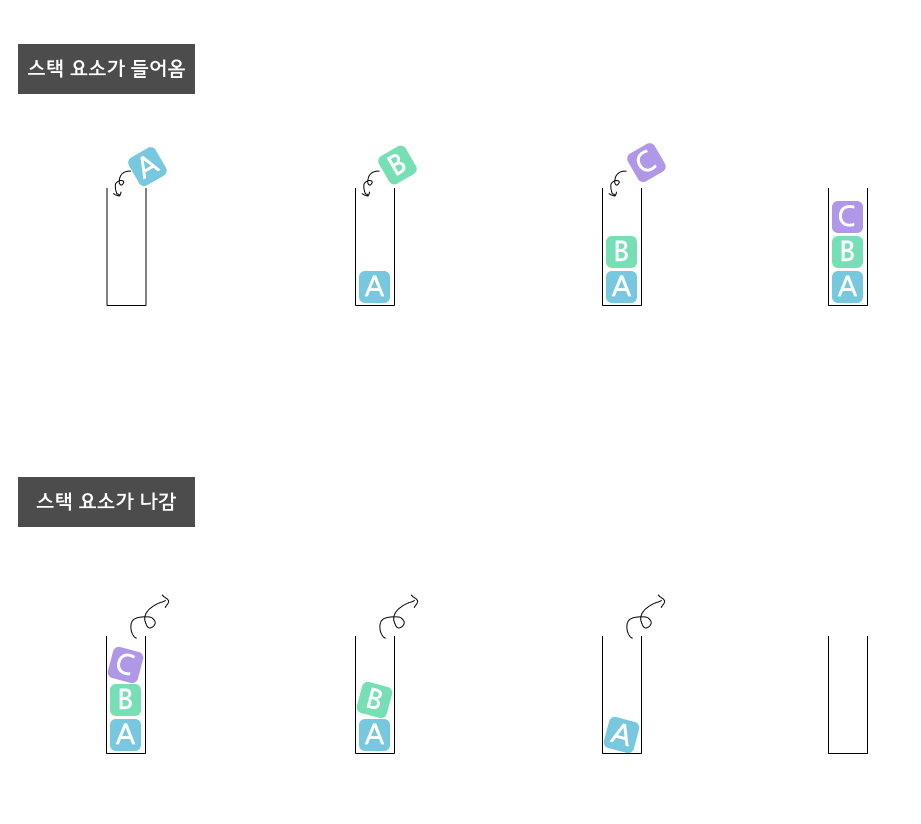이번에도 class 문법으로 구현하는것이 조건이었고, 자료구조 queue와 비슷한 stack 구조를 구현하는것이 목표였다. 큐와는 달리 자료구조 '스택'은 LIFO라는 형태로, Last in First Out, 후입선출이라 부르는 형태로 마지막에 들어온 것이 첫번째로 나가게 된다는 것이다. queue를 설명했을때와 비슷하게 그림으료 표현하면 다음과 같다.
